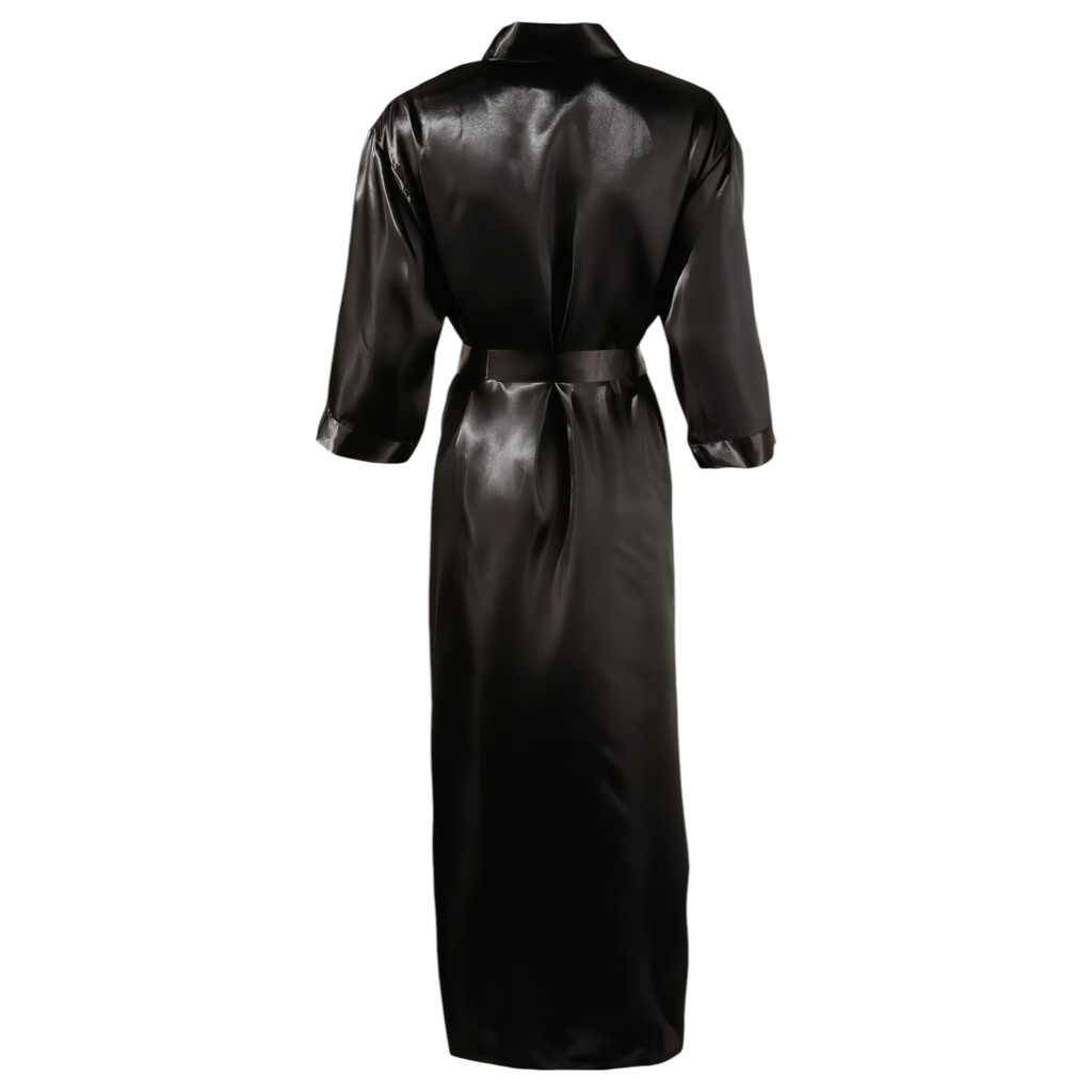 Csillogó, selymes, fekete, lágy esésű szaténból készült hosszú köntös, 3/4-es ujjakkal és a derekán megkötőpánttal. Anyaga: 100% Polyester.