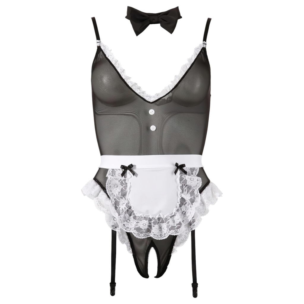 Áttetsző, fekete anyagból, fehér fodrokkal készült szobalány body, szeméremnél és a pospinál nyitott fazonban.