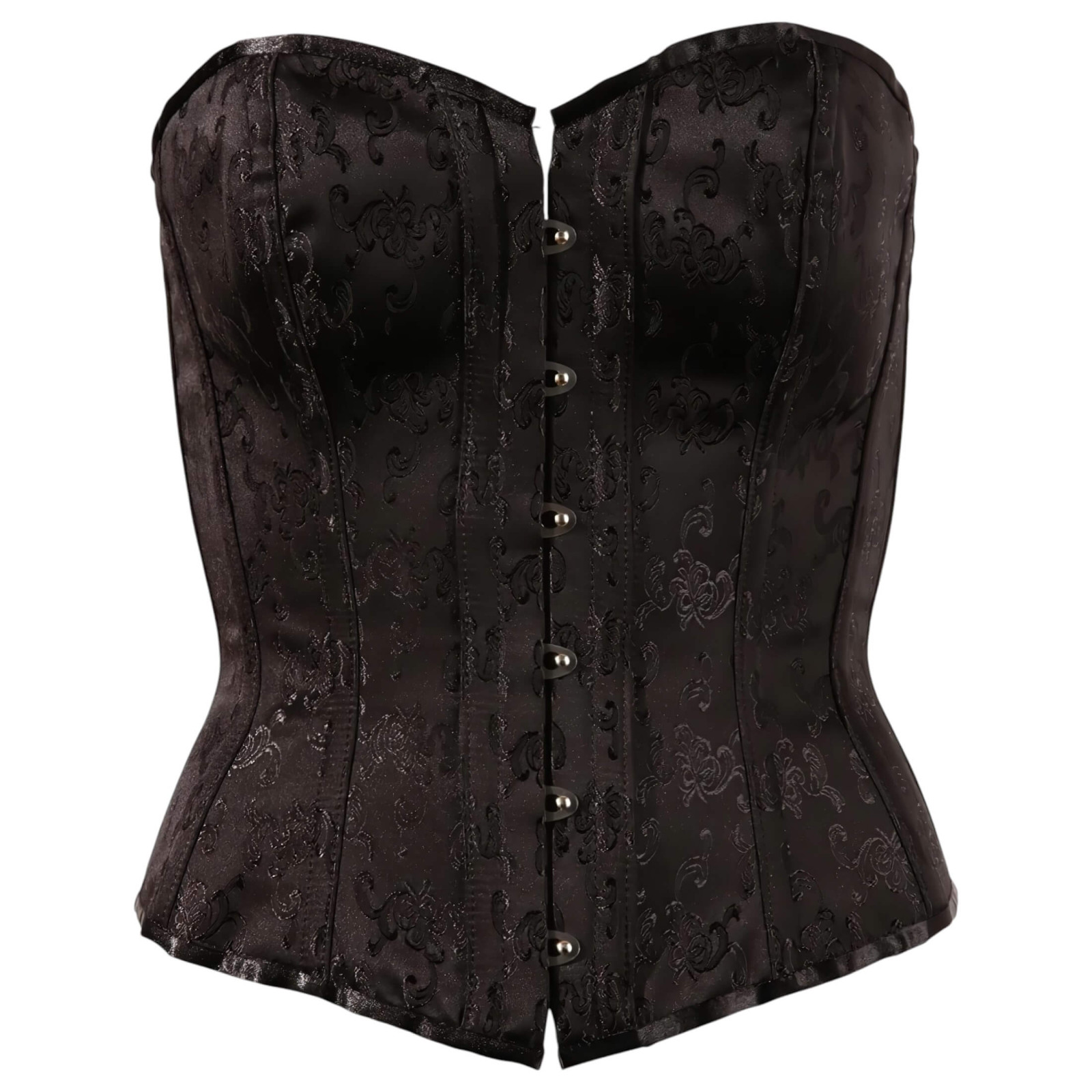 Szív alakú dekoltázzsal, elöl fém kapcsokkal, hátul fűzős kialakítással.
