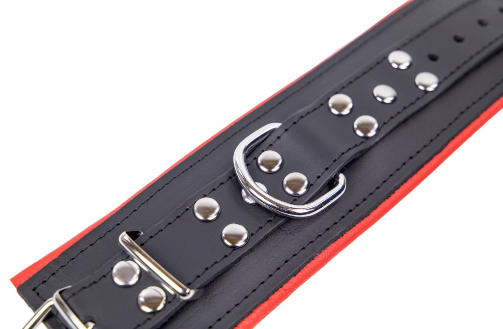 Párnázott bőr csuklókötöző – fekete-piros színben