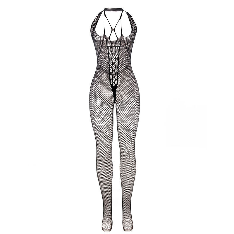 - Stílus: Hosszú fekete hálós body-stocking, nyakpántokkal a mellkason és a háton.