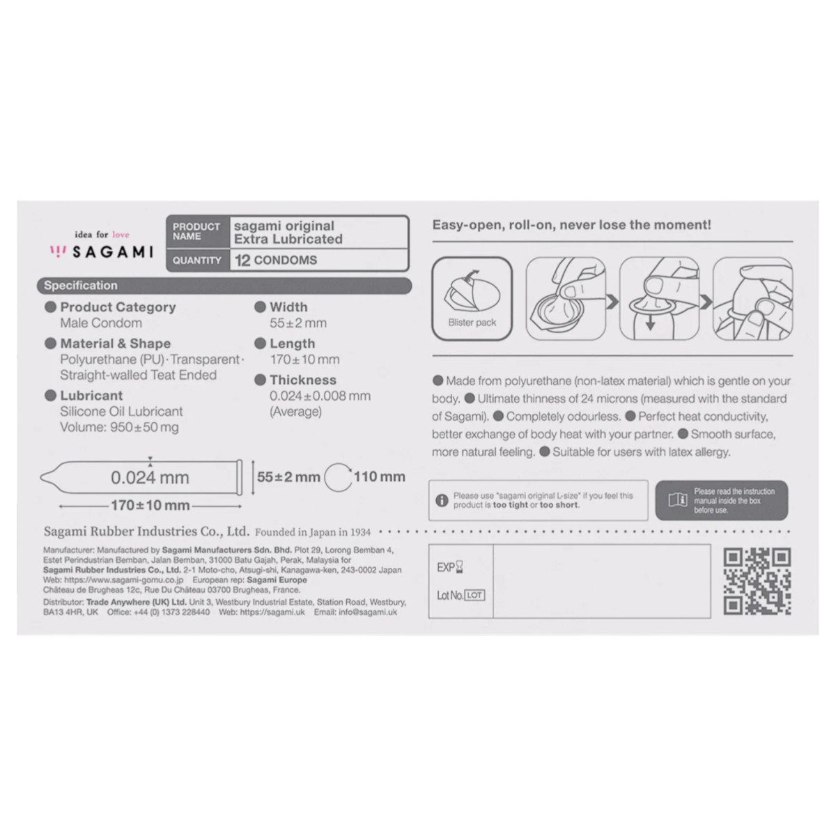 12 db Sagami Original extra síkosított 55 mm óvszer
