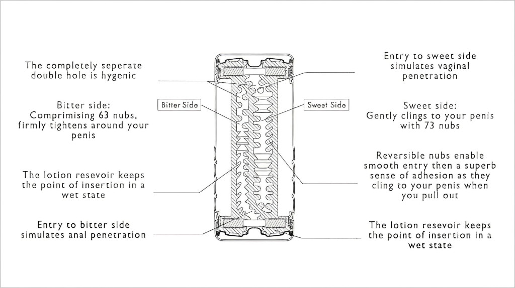 Japán gyártmány. Puha szilikonból készült maszturbátor rendkívül változatos, precíz belső megmunkálással - a legmagasabb minőségi elvárásoknak is megfelel, a stimulálás sokszínűségében pedig igazán magasra teszi a mércét. A termék előre síkosított (vízalapú, bőrgyógyászatilag tesztelt síkosítóval), így nem kell mást tenned, csak átadni magad az élvezetnek. További különlegessége a kétvégű kényeztetőnek, hogy két különálló kéjcsatorna rejtőzik a diszkrét tok alatt. A vaginális nagyobb redőkkel izgat az anális szexjárat pedig feszesebb. A termék egyszeri használatra javasolt, de ha óvszerrel használod, és ügyelsz a higiéniára, többször is élvezheted. Használata nagyon egyszerű: távolítsd el a termékről a színes zsugorfóliát (az oldalán perforált), vedd le a két végéről a zárófedelet - a többi már csak rajtad áll... Mélysége 15cm, a nyílás átmérője kb. 1cm - de extra rugalmas. Diszkrét, színes csomagolásban (színes PVC váz - puha szilikon belső). TENGA termék.