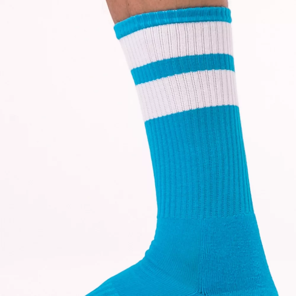 Fedezd fel az edzés új dimenzióját a stílusos, világoskék fitness zoknival! A vékony, bordázott anyag kiváló kényelmet biztosít, míg a fehér csíkok divatos megjelenést kölcsönöznek. Tökéletes kiegészítője a prémium sportruházatnak!