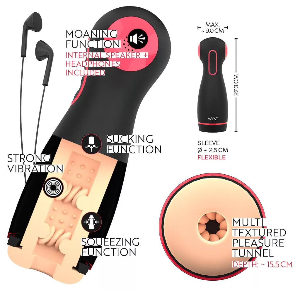 WYNE 06 - akkus, rezgő-szívó maszturbátor (fekete)