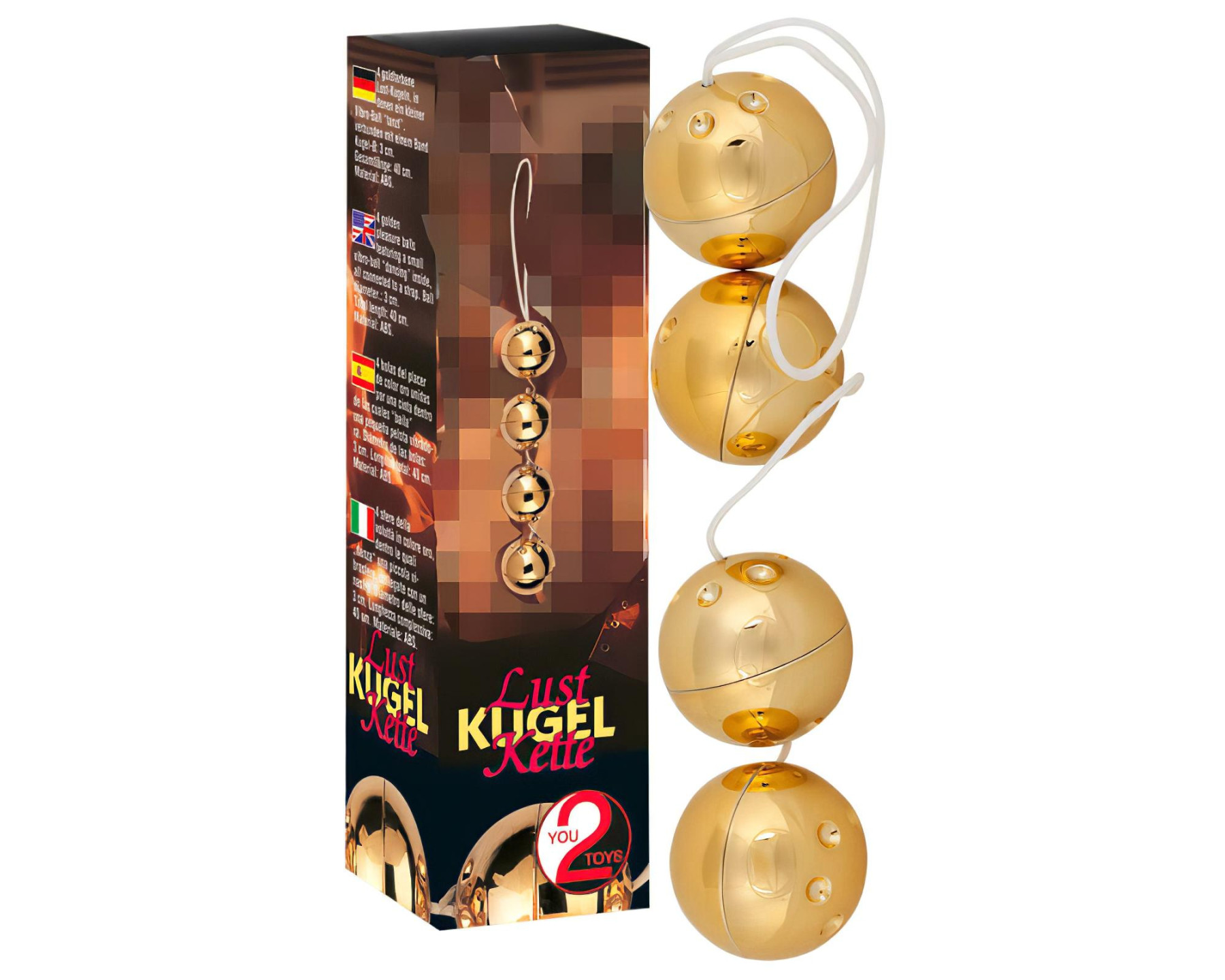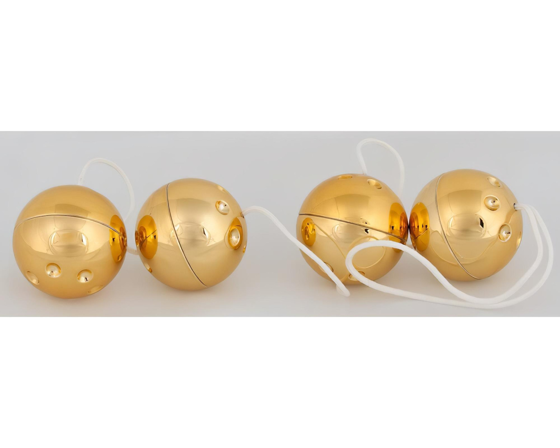 4 érzéki kéjgolyó álló füzér, csillogó arany színben, szilárd anyagból. Belső masszázslabdákkal, így hüvelytornához is kiválóan alkalmas. Teljes hossza 30cm, a golyók átmérője 3cm, így anális élvezetekhez is ajánlott.