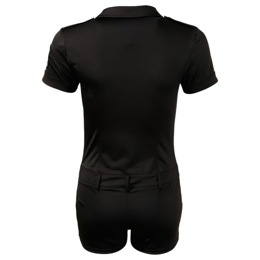 Egy ilyen rendőrnőnek egy férfi sem tud ellenállni. A karcsúsított fazonnak köszönhetően a minioverall szépen követi teste vonalát. Fekete, rugalmas anyagból készül elöl az övtartóig patentos, ott gombos, és a nadrág résznél cipzár van. A melleken apró zsebek találhatók, ujját Special Police embléma díszíti. 90% Polyester, 10% Elasthan.