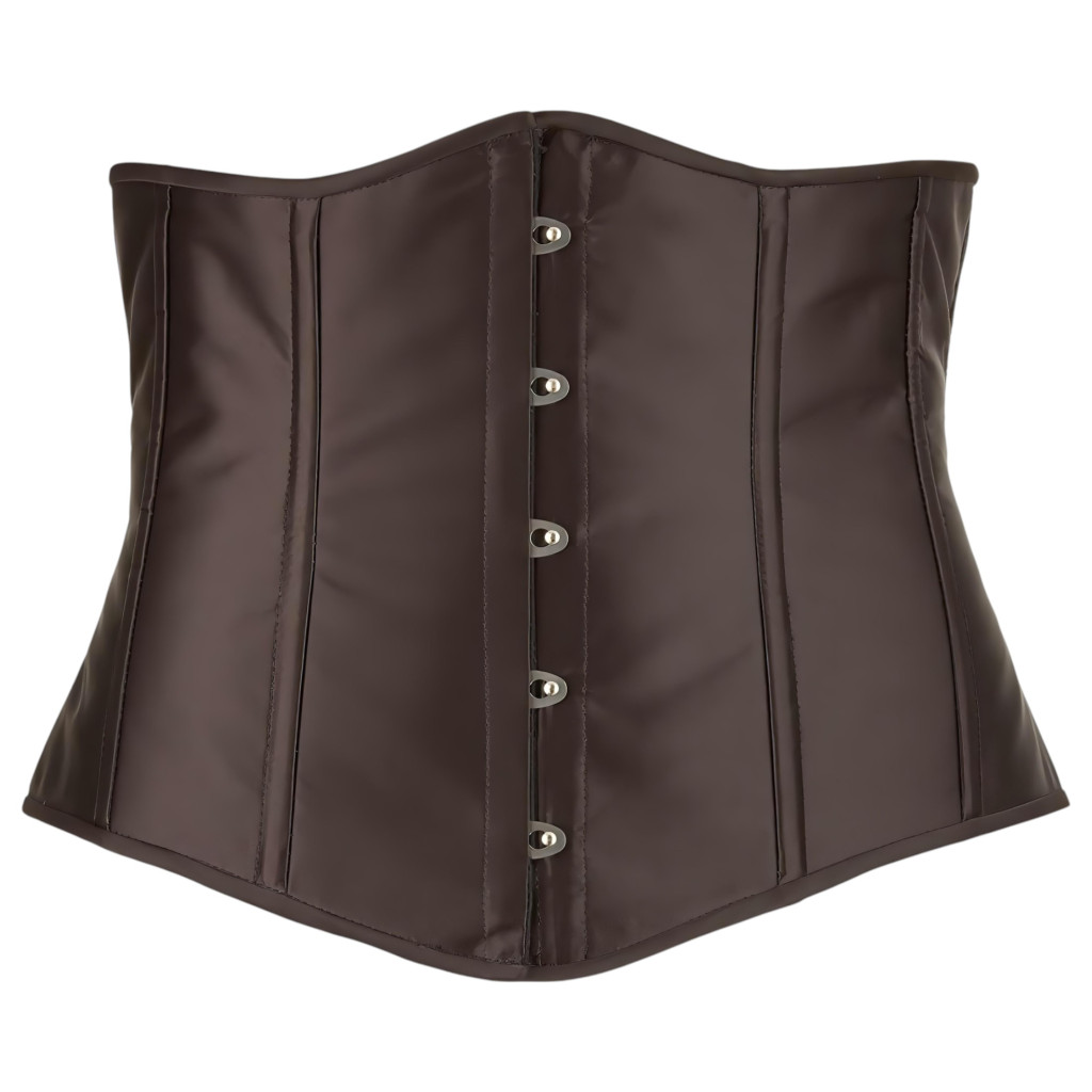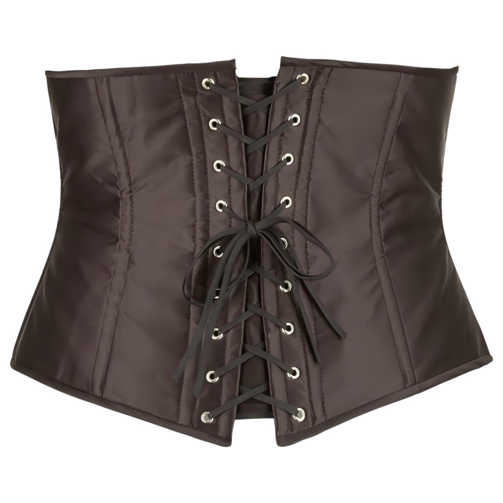 Szatén csillogású anyagból, beépített merevítőkkel készül, elöl fém kapcsokkal, hátul egyénileg állítható, fűzős kialakítással.