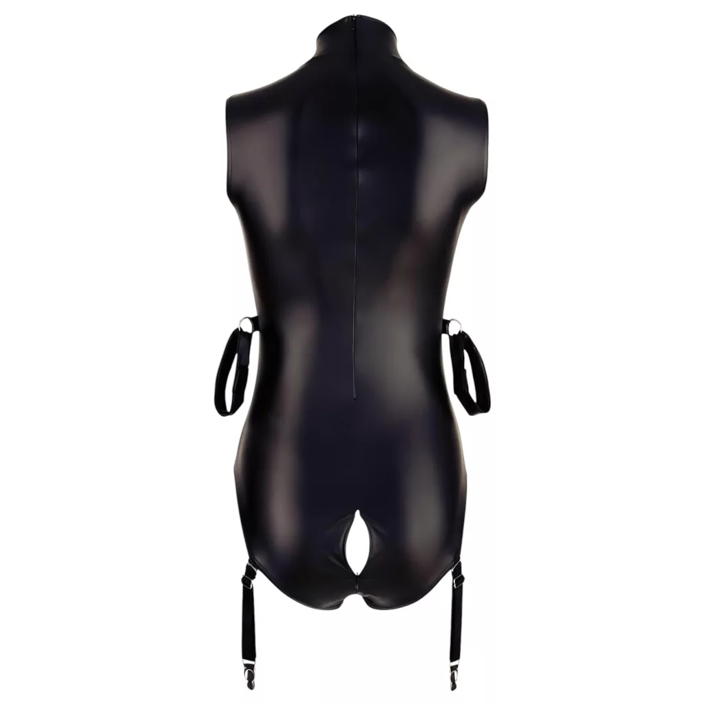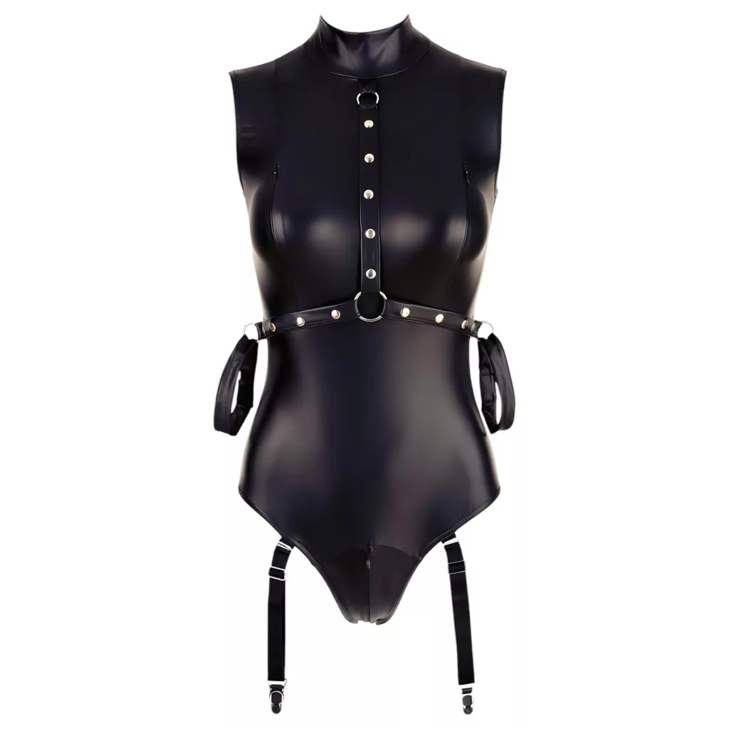 Bőrhatású anyagú body, elöl középen szegecses pántokkal és fém gyűrűvel díszítve.